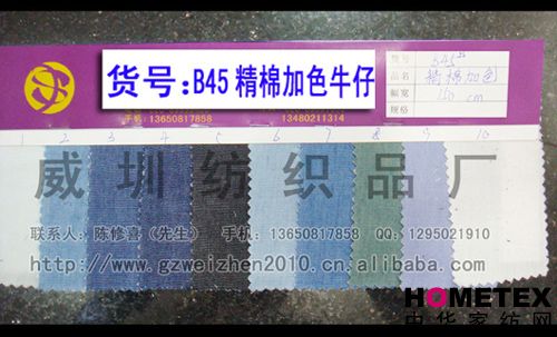 織物組織:平紋 幅寬:150cm 品名:滌棉牛仔 密度:64*47 水洗工藝:砂洗 貨號:B45精棉加色 重量:* 具體用途:休閑服、工作服、褲裝、時(shí)裝 別名:B45精棉加色 印染工藝:印花 成分及含量:65%棉,35%滌 主要用途:服裝用布 ======================================================================= 以上產(chǎn)品全部現貨供應,可隨時(shí)提供樣布卡和現貨,隨時(shí)發(fā)貨。所有產(chǎn)品全部是廠(chǎng)家直銷(xiāo)價(jià),我們承諾:以超低利潤營(yíng)銷(xiāo),我 們只求銷(xiāo)售量。為保證您的利益,我司建議您在采購前先確認我們的品質(zhì)樣與顏色樣后再拿大貨,期待與您的真誠合作。因產(chǎn) 品種類(lèi)較多,具體參考未盡詳盡,如有需要,請您與我們聯(lián)系。 瑞豐紡織(中大旗艦店)坐落于國內最大的紡織面料產(chǎn)業(yè)中心—廣州中大,是一家專(zhuān)業(yè)銷(xiāo)售面料的廠(chǎng)家直銷(xiāo)商。主要經(jīng) 營(yíng)產(chǎn)品有:全棉凈色、仿記憶絲面料、全棉(TC)色織等,面料品種花達上千余種,所有產(chǎn)品全部現貨經(jīng)營(yíng)。 我們面料的品質(zhì)來(lái)源于:1、采用國內外優(yōu)質(zhì)的原材料;2、使用精良的生產(chǎn)工藝和設備;3、完善的生產(chǎn)質(zhì)量管理體系。我 們具有開(kāi)發(fā)和創(chuàng )新品種的強烈意識和優(yōu)越條件,并根據客戶(hù)需求與市場(chǎng)變化時(shí)時(shí)推出潮流面料。憑著(zhù)多年的專(zhuān)業(yè)行業(yè)經(jīng)驗,根 據客戶(hù)需求,不論客戶(hù)在全國任何地方,只要提供小樣,就可在一兩天時(shí)間內輕松獲得所需面料的信息。 批發(fā)說(shuō)明供應商支持混批 。 ============================================================= 有意請加QQ:1295021910或電話(huà)聯(lián)系。 公司名稱(chēng):威圳紡織品廠(chǎng) 聯(lián)系人:陳修喜先生 手機:13650817858 網(wǎng)址:http://www.gzweizhen2010.cn.alibaba.com =============================================================
